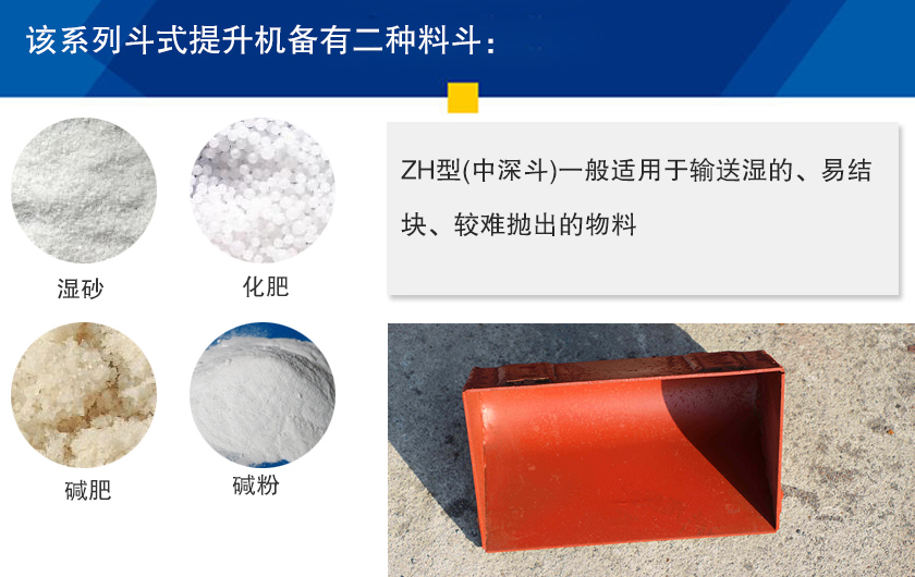 該系列斗式提升機備有二種料斗:ZH型(中深斗)一般適用于輸送濕的、易結(jié)塊、較難拋出的物料,如濕砂、化肥、堿肥、堿粉等。SH型(深斗)一般適用于輸送干燥的、松散易于拋出的物料,如水泥、碎石、煤塊等。