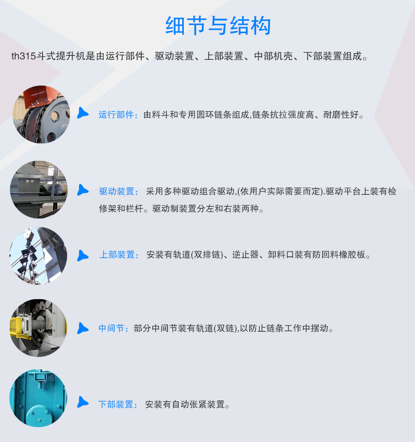 th315斗式提升機斗寬為315mm,料斗容積為6升,斗速1.4米/秒,適合輸送粉末狀,顆粒狀及小塊狀物料,th315斗式提升機輸送量為60立方/時,可選用碳鋼或不銹鋼材質(zhì).