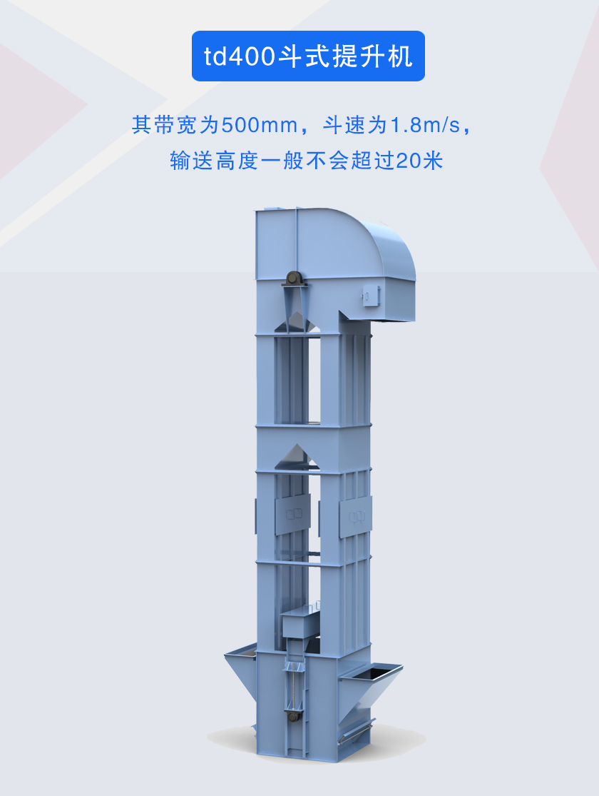 td400斗式提升機(jī)牽引件為橡膠帶,斗寬為400mm,帶寬為500mm,斗速為1.8m/s,提升高度達(dá)80米.提升量每小時(shí)可達(dá)24-66立方,可根據(jù)用戶要求選擇碳鋼和不銹鋼材質(zhì).