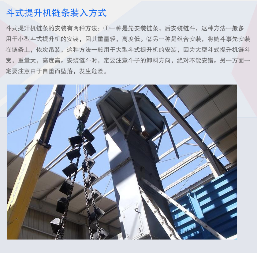斗式提升機鏈條的安裝有兩種方法:①一種是先安裝鏈條,后安裝鏈斗,這種方法一般多用于小型斗式提升機的安裝,因其重量輕,高度低。②另一種是組合安裝,將鏈斗事先安裝在鏈條上,依次吊裝,這種方法一般用于大型斗式提升機的安裝,因為大型斗式提升機鏈斗寬,重量大,高度高。安裝鏈斗時,定要注意斗子的卸料方向,不能安錯。另一方面一定要注意由于自重而墜落,發(fā)生危險。