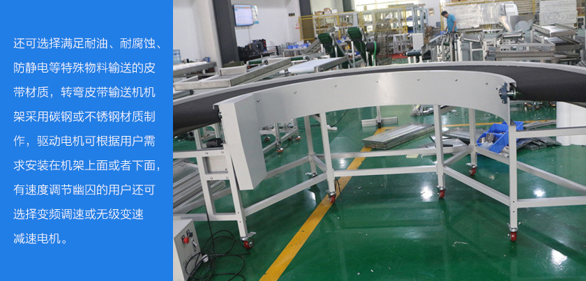 轉彎皮帶輸送機簡稱轉彎皮帶機,是輸送流水線中使用比較廣泛的一種設備,用于輸送帶與輸送帶之間彎角的連續或間歇運動來輸送各種輕重不同的物料,常見的角度為30°,45°,90°和180°,能夠滿足各種轉彎輸送的工藝要求,轉彎皮帶輸送機輸送帶可根據輸送物料的性質選擇PVC、PU材質,除輸送普通物料外,還可選擇滿足耐油、耐腐蝕、防靜電等特殊物料輸送的皮帶材質,轉彎皮帶輸送機機架采用碳鋼或不銹鋼材質制作,驅動電機可根據用戶需求安裝在機架上面或者下面,有速度調節幽囚的用戶還可選擇變頻調速或無級變速減速電機。