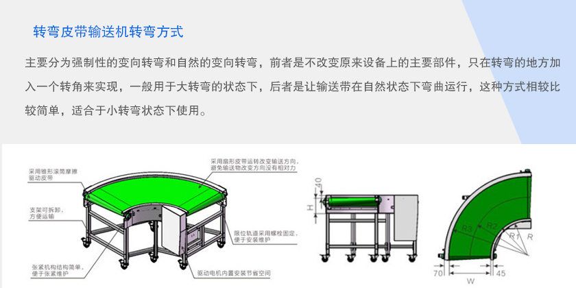 主要分為強制性的變向轉彎和自然的變向轉彎,前者是不改變原來設備上的主要部件,只在轉彎的地方加入一個轉角來實現,一般用于大轉彎的狀態下,后者是讓輸送帶在自然狀態下彎曲運行,這種方式相較比較簡單,適合于小轉彎狀態下使用。