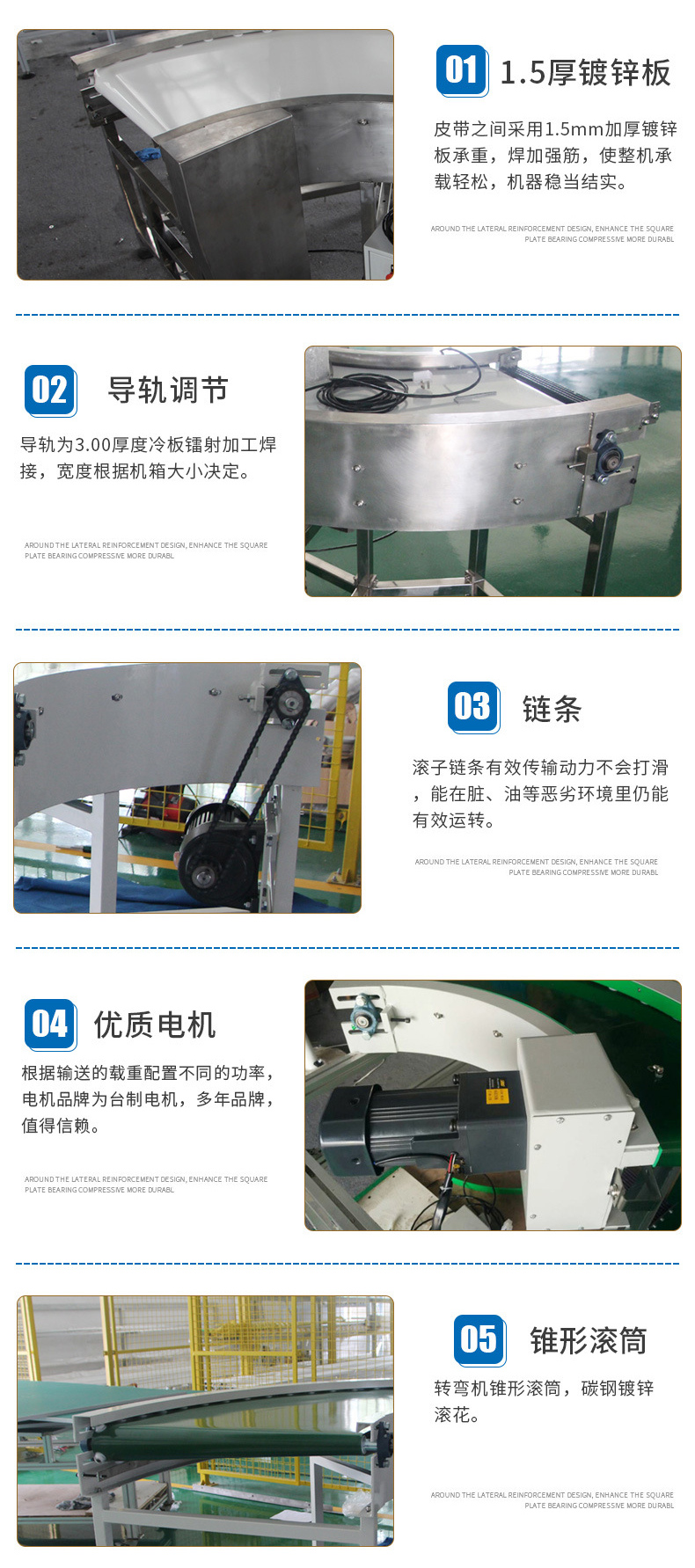 1、轉彎皮帶機結構形式有30度轉彎皮帶機、45度轉彎皮帶機、90度轉彎皮帶機、180度轉彎皮帶機, 能滿足各種轉彎輸送的工藝要求。