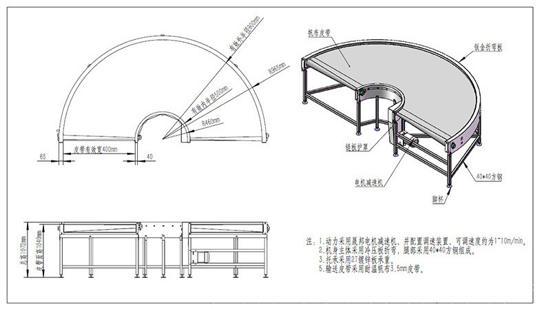 1、相較普通輸送機增加轉彎功能,可滿足各種輸送工藝要求。