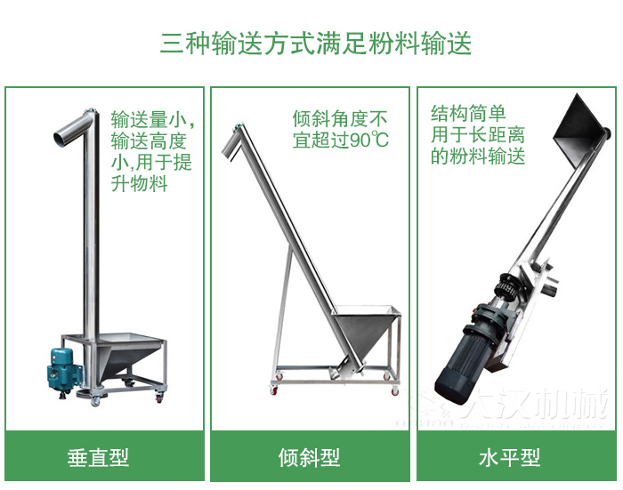 垂直型管式螺旋輸送機(jī)——輸送量小,輸送高度小,轉(zhuǎn)速較高,能耗大。特別適宜輸送流動(dòng)性好的粉粒狀物料,主要用于提升物料,提升高度一般不大于8米。