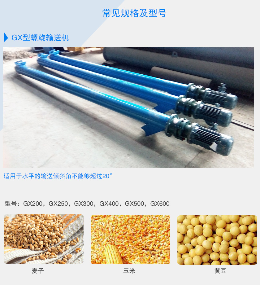 GX型螺旋輸送機是較老的螺旋輸送設備,其有單管于雙管兩種形式,適用于水平的輸送傾斜角不能夠超過20°。可輸送一些塊狀的(小塊狀物料)例如:麥子,玉米,黃豆等糧食。